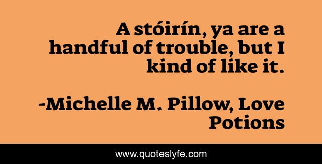 This page presents the quote "A stóirín, ya are a handful of trouble, but I kind of like it.". Author of this quote is Michelle M. Pillow, Love Potions. This quote is about warlock, humor, power, witchcraft, macgregor, spell, love-potions, walk-of-shame, scottish,.