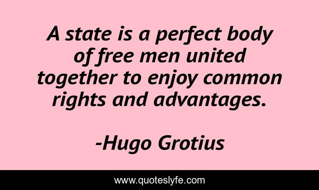 This page presents the quote "A state is a perfect body of free men united together to enjoy common rights and advantages.". Author of this quote is Hugo Grotius. .