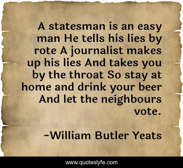 This page presents the quote "A statesman is an easy man He tells his lies by rote A journalist makes up his lies And takes you by the throat So stay at home and drink your beer And let the neighbours vote.". Author of this quote is William Butler Yeats. .