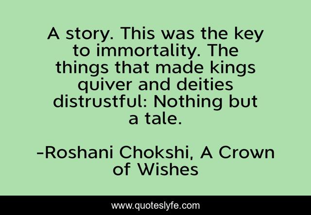 This page presents the quote "A story. This was the key to immortality. The things that made kings quiver and deities distrustful: Nothing but a tale.". Author of this quote is Roshani Chokshi, A Crown of Wishes. This quote is about power-of-story, story,.