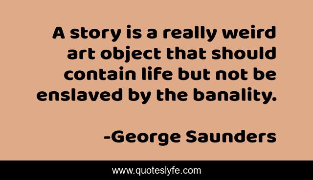 This page presents the quote "A story is a really weird art object that should contain life but not be enslaved by the banality.". Author of this quote is George Saunders. .