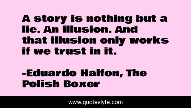 This page presents the quote "A story is nothing but a lie. An illusion. And that illusion only works if we trust in it.". Author of this quote is Eduardo Halfon, The Polish Boxer. This quote is about story, trust, illusion,.