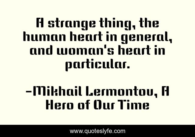 This page presents the quote "A strange thing, the human heart in general, and woman's heart in particular.". Author of this quote is Mikhail Lermontov, A Hero of Our Time. This quote is about heart, woman, love, human, affection,.