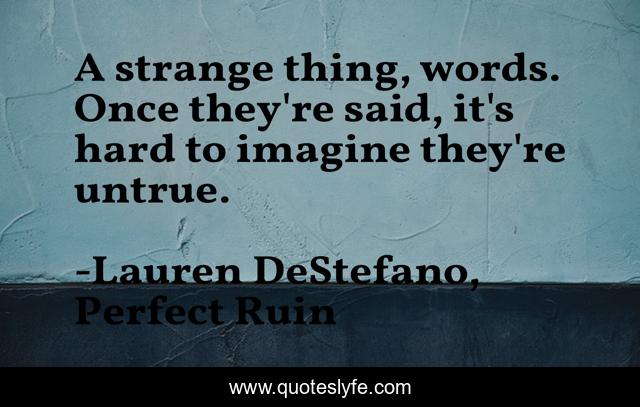 This page presents the quote "A strange thing, words. Once they're said, it's hard to imagine they're untrue.". Author of this quote is Lauren DeStefano, Perfect Ruin. This quote is about imagination, dreams, truths, language, truth,.