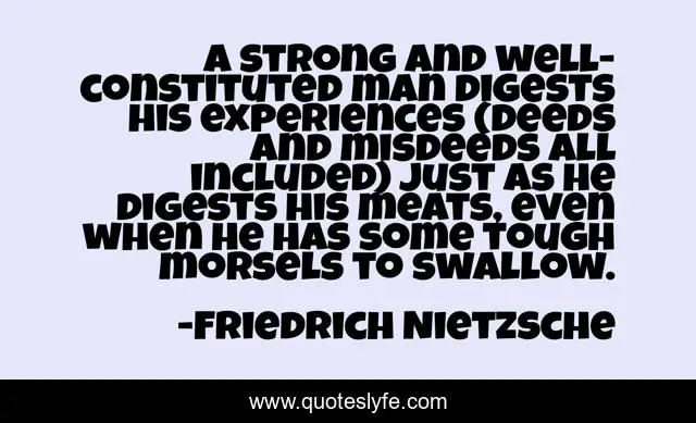 This page presents the quote "A strong and well-constituted man digests his experiences (deeds and misdeeds all included) just as he digests his meats, even when he has some tough morsels to swallow.". Author of this quote is Friedrich Nietzsche. This quote is about character, meat, experience,.