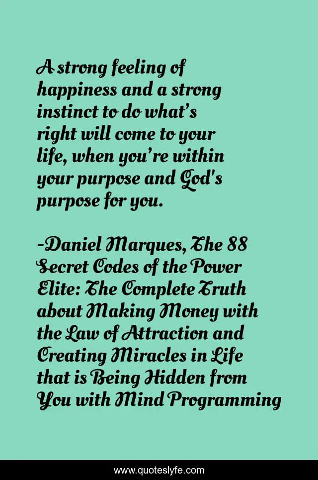 This page presents the quote "A strong feeling of happiness and a strong instinct to do what’s right will come to your life, when you’re within your purpose and God's purpose for you.". Author of this quote is Daniel Marques, The 88 Secret Codes of the Power Elite: The Complete Truth about Making Money with the Law of Attraction and Creating Miracles in Life that is Being Hidden from You with Mind Programming. .