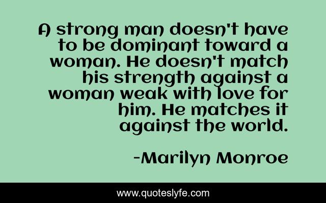 This page presents the quote "A strong man doesn't have to be dominant toward a woman. He doesn't match his strength against a woman weak with love for him. He matches it against the world.". Author of this quote is Marilyn Monroe. This quote is about strength, strong, man,.