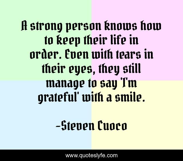 This page presents the quote "A strong person knows how to keep their life in order. Even with tears in their eyes, they still manage to say 'I'm grateful' with a smile.". Author of this quote is Steven Cuoco. This quote is about life-philosophy, best-ever, quote-of-the-day, quotes-to-live-by,.