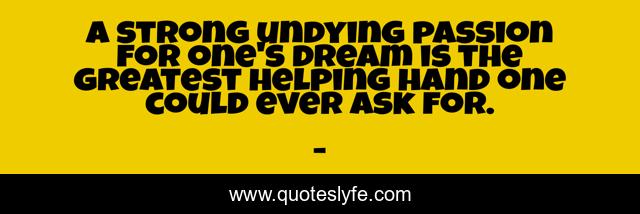 This page presents the quote "A strong undying passion for one's dream is the greatest helping hand one could ever ask for.". Author of this quote is . This quote is about having-passion-for-one-s-dream, edmond-mbiaka, be-passionate-about-your-dream, turn-your-passion-into-a-dream, a-strong-passion, follow-your-passion, helping-hand,.