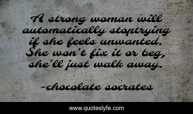 This page presents the quote "A strong woman will automatically stoptrying if she feels unwanted. She won't fix it or beg, she'll just walk away.". Author of this quote is chocolate socrates. This quote is about quotes, life, inpiration, deep, woman,.