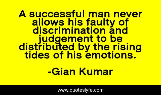 This page presents the quote "A successful man never allows his faulty of discrimination and judgement to be distributed by the rising tides of his emotions.". Author of this quote is Gian Kumar. This quote is about sucessessful, emotions,.