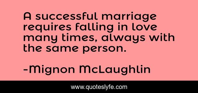 This page presents the quote "A successful marriage requires falling in love many times, always with the same person.". Author of this quote is Mignon McLaughlin. This quote is about successful, marriage,.