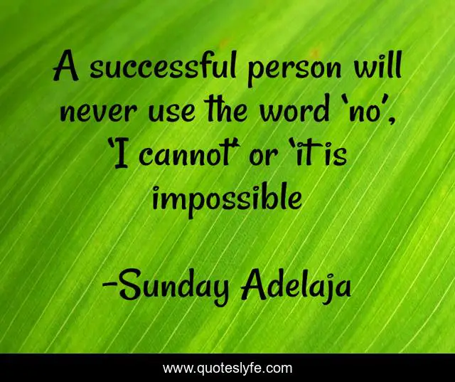 This page presents the quote "A successful person will never use the word ‘no’, ‘I cannot’ or ‘it is impossible". Author of this quote is Sunday Adelaja. This quote is about prosperity, use, word, wealth, no, successful, money, riches, person,.