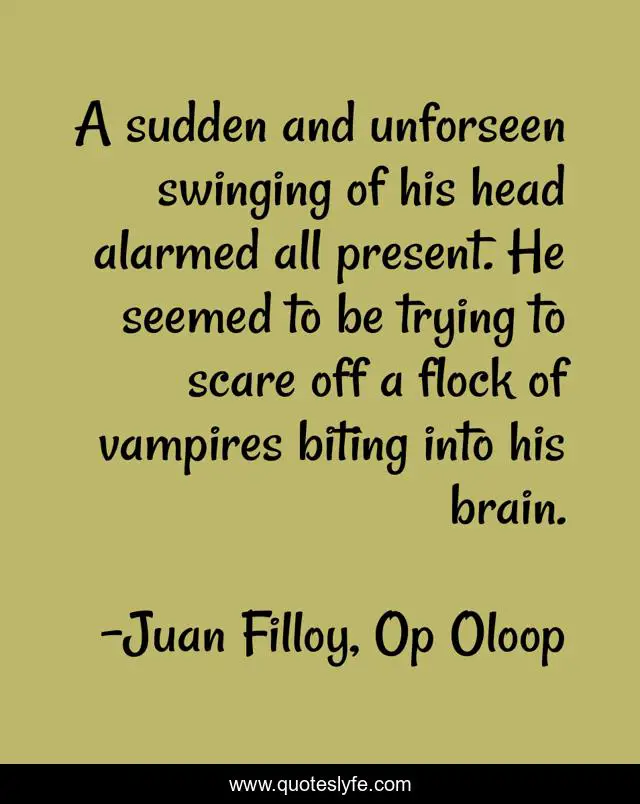 This page presents the quote "A sudden and unforseen swinging of his head alarmed all present. He seemed to be trying to scare off a flock of vampires biting into his brain.". Author of this quote is Juan Filloy, Op Oloop. .