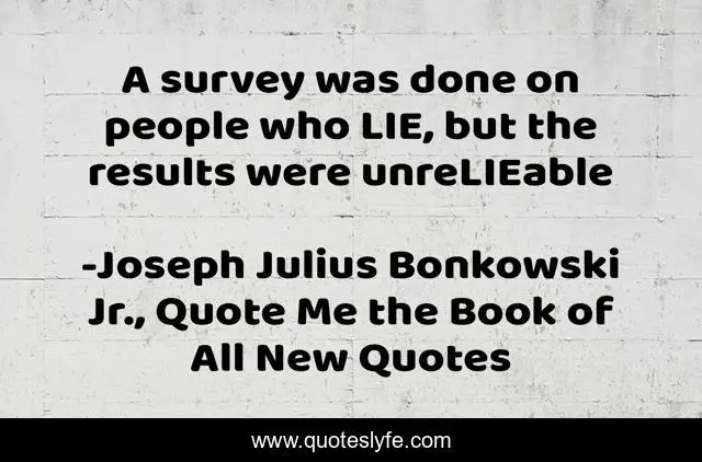 This page presents the quote "A survey was done on people who LIE, but the results were unreLIEable". Author of this quote is Joseph Julius Bonkowski Jr., Quote Me the Book of All New Quotes. This quote is about funny, humorous, humours, liars, comedy, lying,.