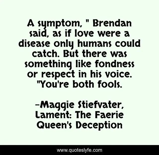 This page presents the quote "A symptom, " Brendan said, as if love were a disease only humans could catch. But there was something like fondness or respect in his voice. "You're both fools.". Author of this quote is Maggie Stiefvater, Lament: The Faerie Queen's Deception. This quote is about love, music, affection,.