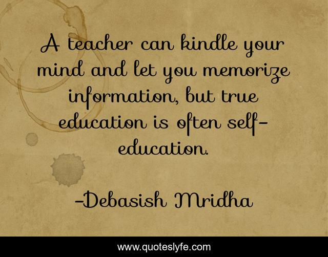 This page presents the quote "A teacher can kindle your mind and let you memorize information, but true education is often self-education.". Author of this quote is Debasish Mridha. This quote is about true-education, self-education, philosophy, debasish-mridha, debasish-mridha-m-d, quotes, inspirational, teaching, enthusiasm,.