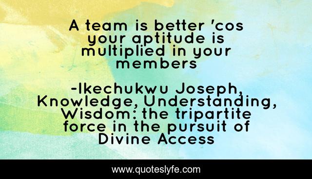 This page presents the quote "A team is better 'cos your aptitude is multiplied in your members". Author of this quote is Ikechukwu Joseph, Knowledge, Understanding, Wisdom: the tripartite force in the pursuit of Divine Access. This quote is about christianity, self-help-book, wisdom,.