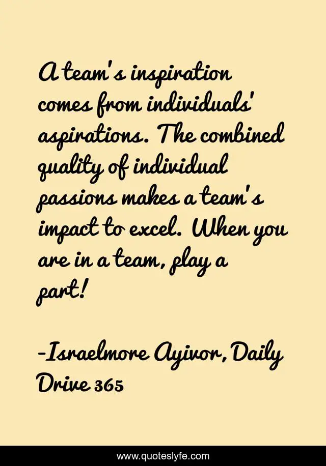 This page presents the quote "A team's inspiration comes from individuals' aspirations. The combined quality of individual passions makes a team's impact to excel. When you are in a team, play a part!". Author of this quote is Israelmore Ayivor, Daily Drive 365. This quote is about inspirations, inspire, individual, quality, impact, food-for-thought, excel, teamwork, combine,.
