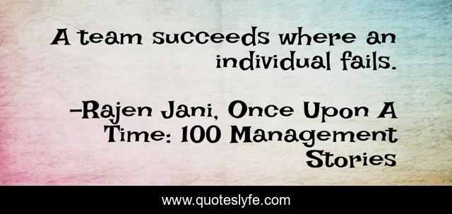 This page presents the quote "A team succeeds where an individual fails.". Author of this quote is Rajen Jani, Once Upon A Time: 100 Management Stories. This quote is about motivation, communication, sales, anger, improvement, quality, management, knowledge, strategy,.