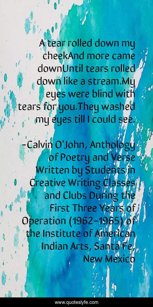 "Calvin O'John, Anthology of Poetry and Verse Written by Students in Creative Writing Classes and Clubs During the First Three Years of Operation (1962-1965) of the Institute of American Indian Arts, Santa Fe, New Mexico Quotes." Quoteslyfe.com, 2025. Sat. 06 Dec. 2025. <https://www.quoteslyfe.com/quote/A-tear-rolled-down-my-cheekAnd-more-124343>.