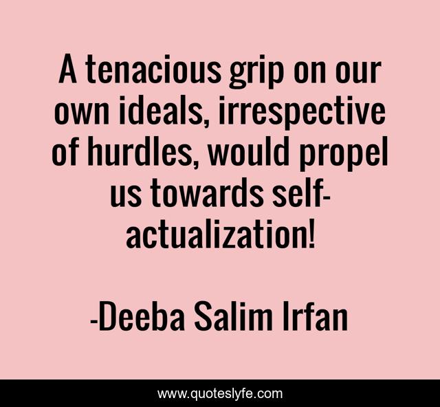 This page presents the quote "A tenacious grip on our own ideals, irrespective of hurdles, would propel us towards self-actualization!". Author of this quote is Deeba Salim Irfan. This quote is about hurdles, goal, goal-achievement, self-actualization, focus, goals, love-hurts,.