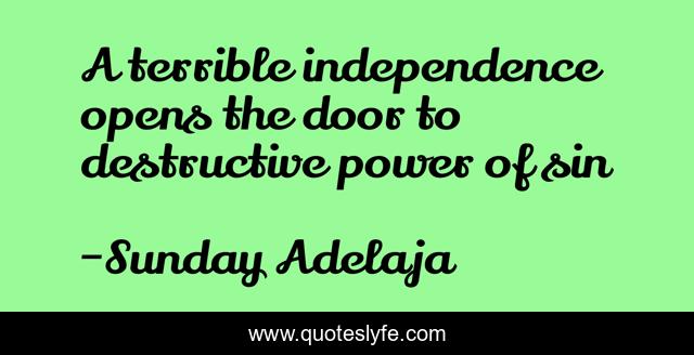 This page presents the quote "A terrible independence opens the door to destructive power of sin". Author of this quote is Sunday Adelaja. This quote is about door, power, terrible, power-of-sin, destructive, sin, independence,.