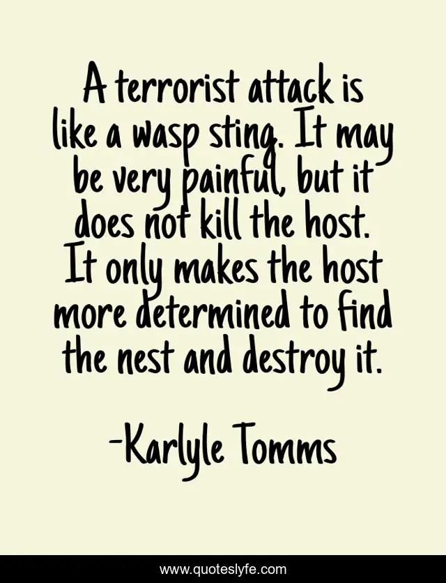 This page presents the quote "A terrorist attack is like a wasp sting. It may be very painful, but it does not kill the host. It only makes the host more determined to find the nest and destroy it.". Author of this quote is Karlyle Tomms. .