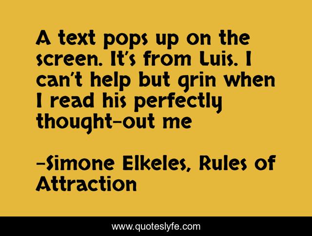 This page presents the quote "A text pops up on the screen. It’s from Luis. I can’t help but grin when I read his perfectly thought-out me". Author of this quote is Simone Elkeles, Rules of Attraction. This quote is about funny, humour, young-adult-romance, romance, young-adult-fiction, comedy,.