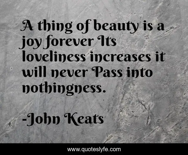 "John Keats Quotes." Quoteslyfe.com, 2025. Mon. 08 Dec. 2025. <https://www.quoteslyfe.com/quote/A-thing-of-beauty-is-a-joy-264639>.