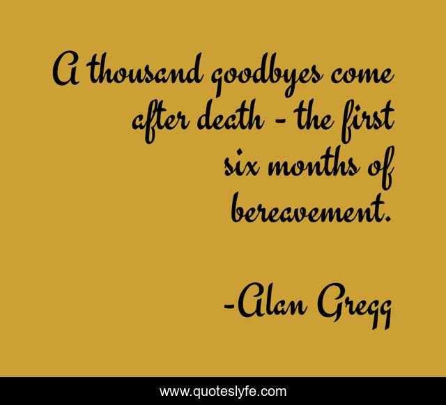 This page presents the quote "A thousand goodbyes come after death - the first six months of bereavement.". Author of this quote is Alan Gregg. This quote is about death, dying,.