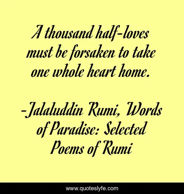 This page presents the quote "A thousand half-loves must be forsaken to take one whole heart home.". Author of this quote is Jalaluddin Rumi, Words of Paradise: Selected Poems of Rumi. This quote is about love, affection,.