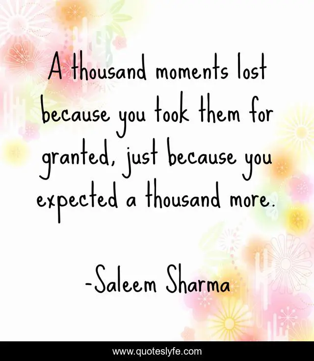 This page presents the quote "A thousand moments lost because you took them for granted, just because you expected a thousand more.". Author of this quote is Saleem Sharma. This quote is about moments, memories, life, love, affection,.