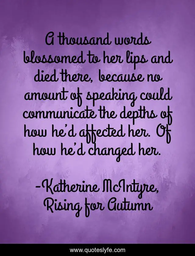 This page presents the quote "A thousand words blossomed to her lips and died there, because no amount of speaking could communicate the depths of how he’d affected her. Of how he’d changed her.". Author of this quote is Katherine McIntyre, Rising for Autumn. This quote is about affected, love, communication, changed, intensity, speaking, words, words-unspoken, affection,.