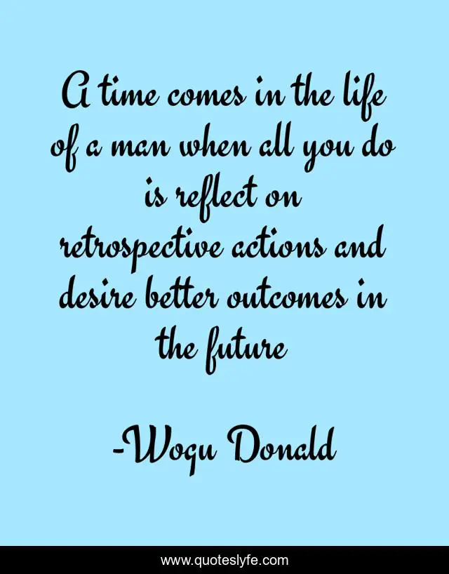 This page presents the quote "A time comes in the life of a man when all you do is reflect on retrospective actions and desire better outcomes in the future". Author of this quote is Wogu Donald. This quote is about relationships, enthusiasm, educational, inspirational, entrepreneurship,.