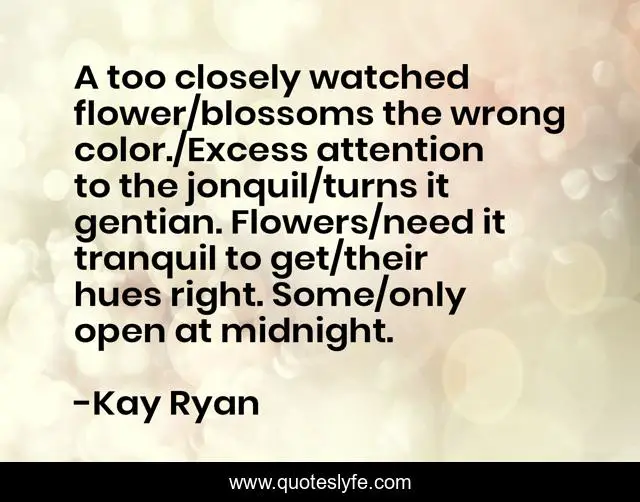 This page presents the quote "A too closely watched flower/blossoms the wrong color./Excess attention to the jonquil/turns it gentian. Flowers/need it tranquil to get/their hues right. Some/only open at midnight.". Author of this quote is Kay Ryan. .