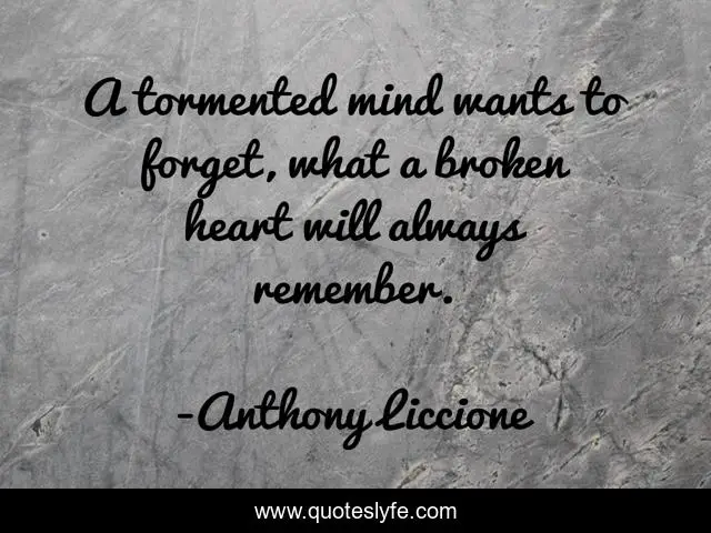 This page presents the quote "A tormented mind wants to forget, what a broken heart will always remember.". Author of this quote is Anthony Liccione. This quote is about broken-heart, pain, forget, memories, tormented-mind, remember,.