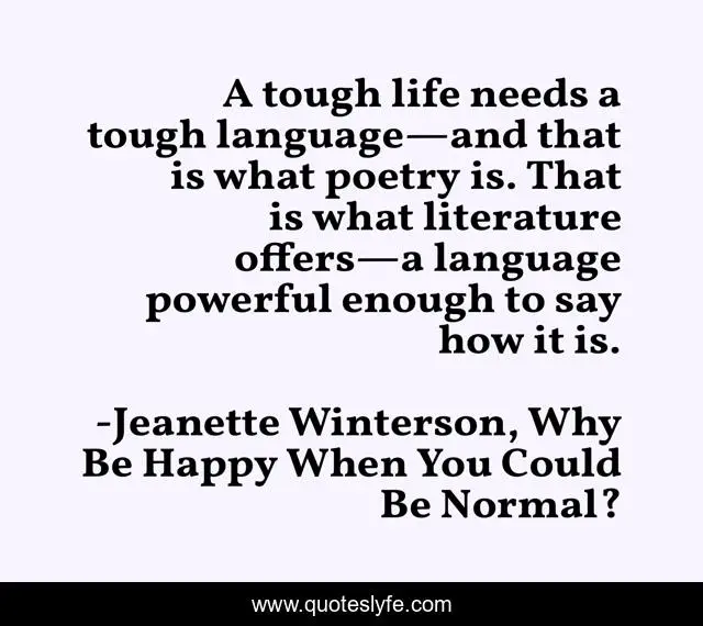 This page presents the quote "A tough life needs a tough language—and that is what poetry is. That is what literature offers—a language powerful enough to say how it is.". Author of this quote is Jeanette Winterson, Why Be Happy When You Could Be Normal?. This quote is about life, literature, language, poetry, books, words, reading,.