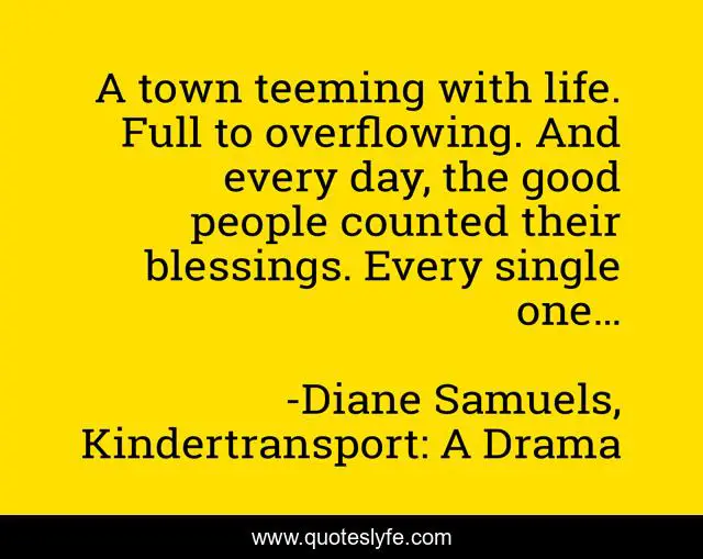 This page presents the quote "A town teeming with life. Full to overflowing. And every day, the good people counted their blessings. Every single one…". Author of this quote is Diane Samuels, Kindertransport: A Drama. This quote is about simplicity, life, love, family, people-relationships, community, blessings, affection,.