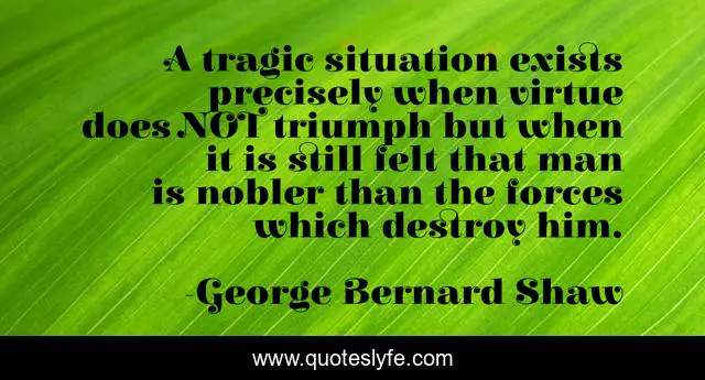This page presents the quote "A tragic situation exists precisely when virtue does NOT triumph but when it is still felt that man is nobler than the forces which destroy him.". Author of this quote is George Bernard Shaw. .