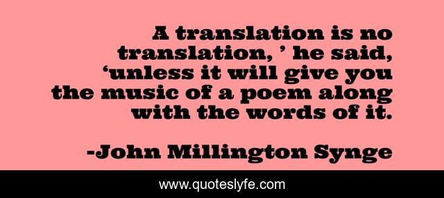 This page presents the quote "A translation is no translation, ’ he said, ‘unless it will give you the music of a poem along with the words of it.". Author of this quote is John Millington Synge. This quote is about translation, literature, music,.