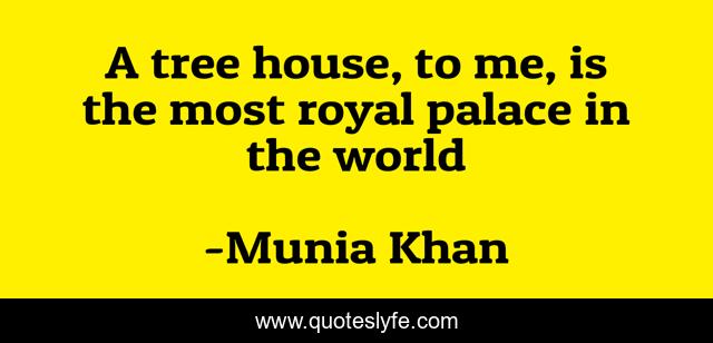 This page presents the quote "A tree house, to me, is the most royal palace in the world". Author of this quote is Munia Khan. This quote is about beautiful, palace, nature, house, royal, treehouse, tree, love-of-nature, most,.