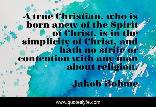This page presents the quote "A true Christian, who is born anew of the Spirit of Christ, is in the simplicity of Christ, and hath no strife or contention with any man about religion.". Author of this quote is Jakob Bohme. This quote is about simplicity, christian, man,.