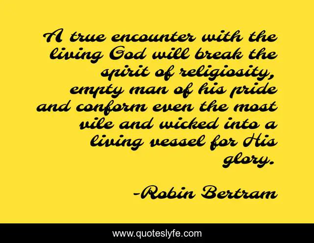This page presents the quote "A true encounter with the living God will break the spirit of religiosity, empty man of his pride and conform even the most vile and wicked into a living vessel for His glory.". Author of this quote is Robin Bertram. This quote is about spiritual-growth, pride, spiritual-wisdom, religiousity, spirituality,.