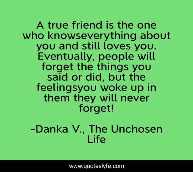 This page presents the quote "A true friend is the one who knowseverything about you and still loves you. Eventually, people will forget the things you said or did, but the feelingsyou woke up in them they will never forget!". Author of this quote is Danka V., The Unchosen Life. .