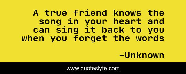This page presents the quote "A true friend knows the song in your heart and can sing it back to you when you forget the words". Author of this quote is Unknown. This quote is about friends, love, friendship, affection,.