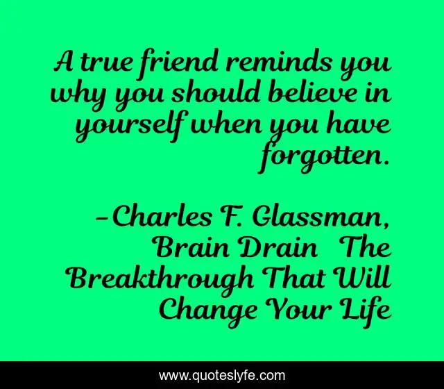 This page presents the quote "A true friend reminds you why you should believe in yourself when you have forgotten.". Author of this quote is Charles F. Glassman, Brain Drain The Breakthrough That Will Change Your Life. .