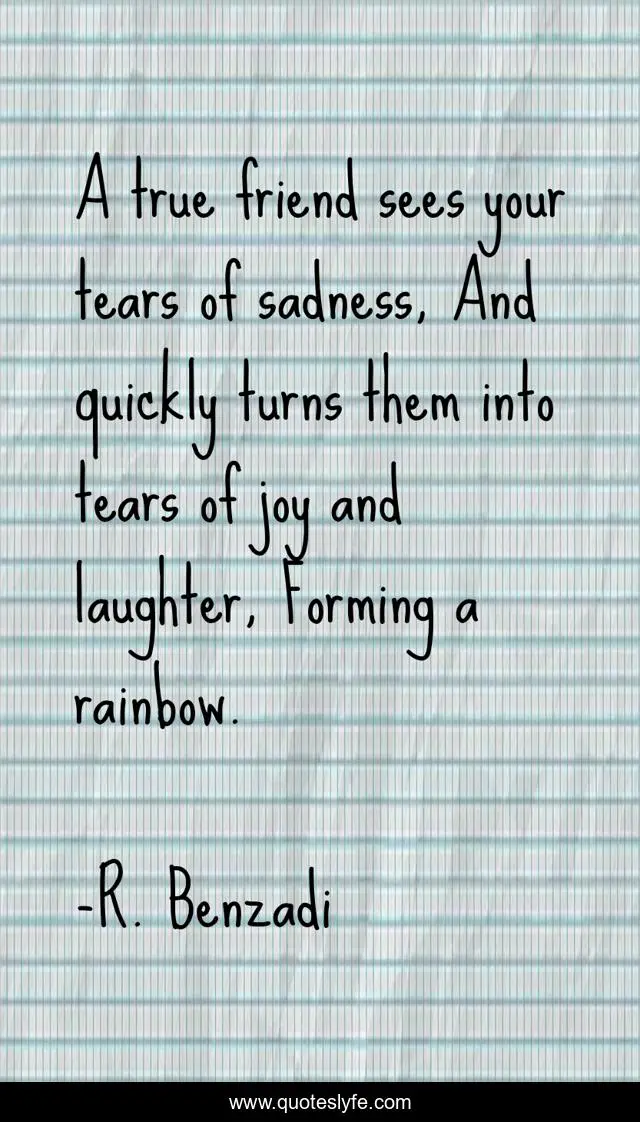 This page presents the quote "A true friend sees your tears of sadness, And quickly turns them into tears of joy and laughter, Forming a rainbow.". Author of this quote is R. Benzadi. This quote is about joy, tears, friendship, true-friend, benzadi,.
