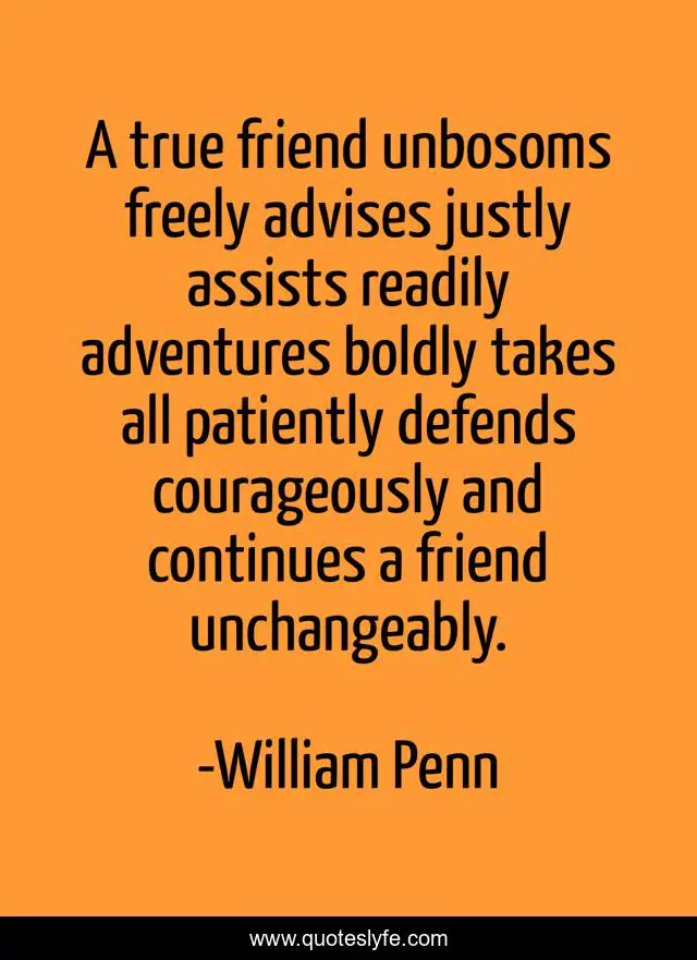 This page presents the quote "A true friend unbosoms freely advises justly assists readily adventures boldly takes all patiently defends courageously and continues a friend unchangeably.". Author of this quote is William Penn. .