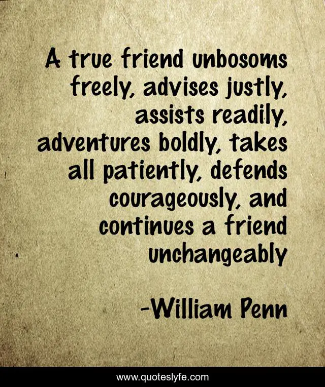 This page presents the quote "A true friend unbosoms freely, advises justly, assists readily, adventures boldly, takes all patiently, defends courageously, and continues a friend unchangeably". Author of this quote is William Penn. .